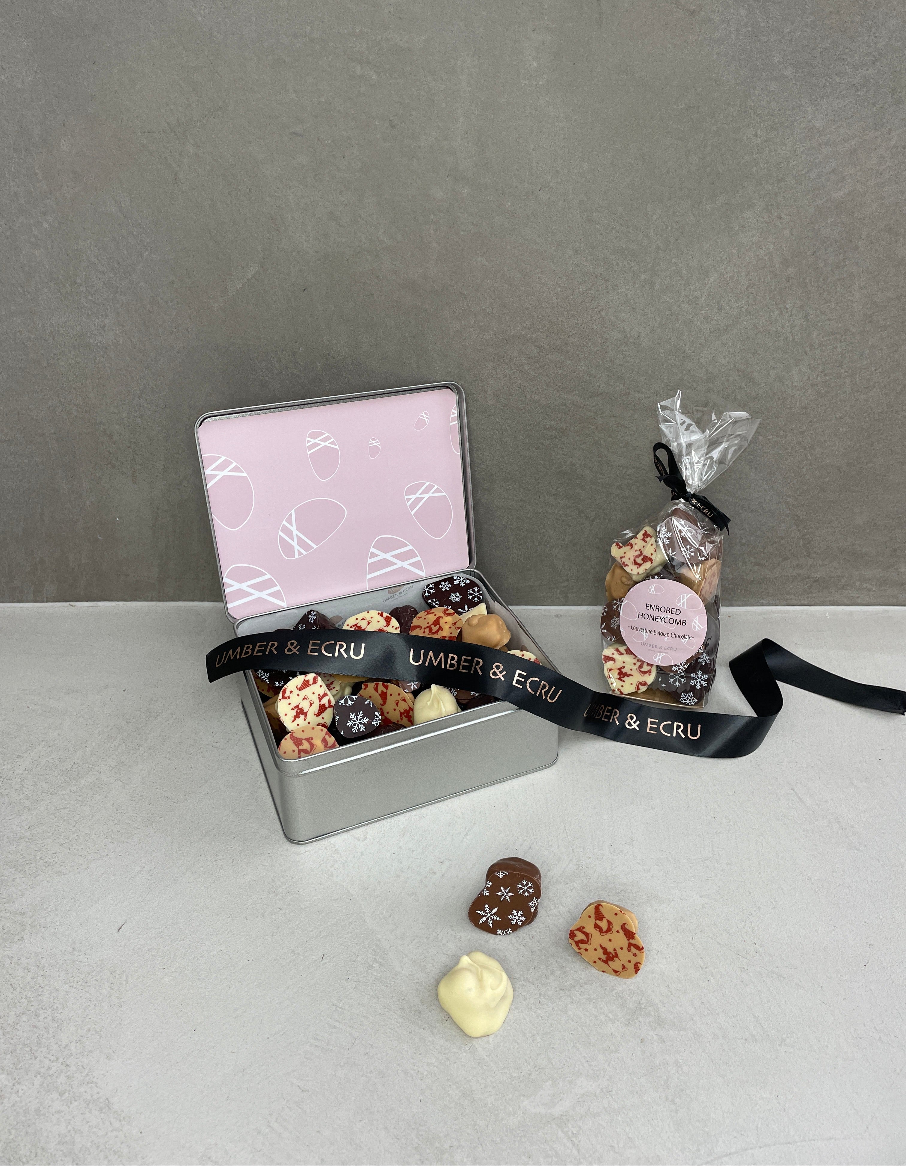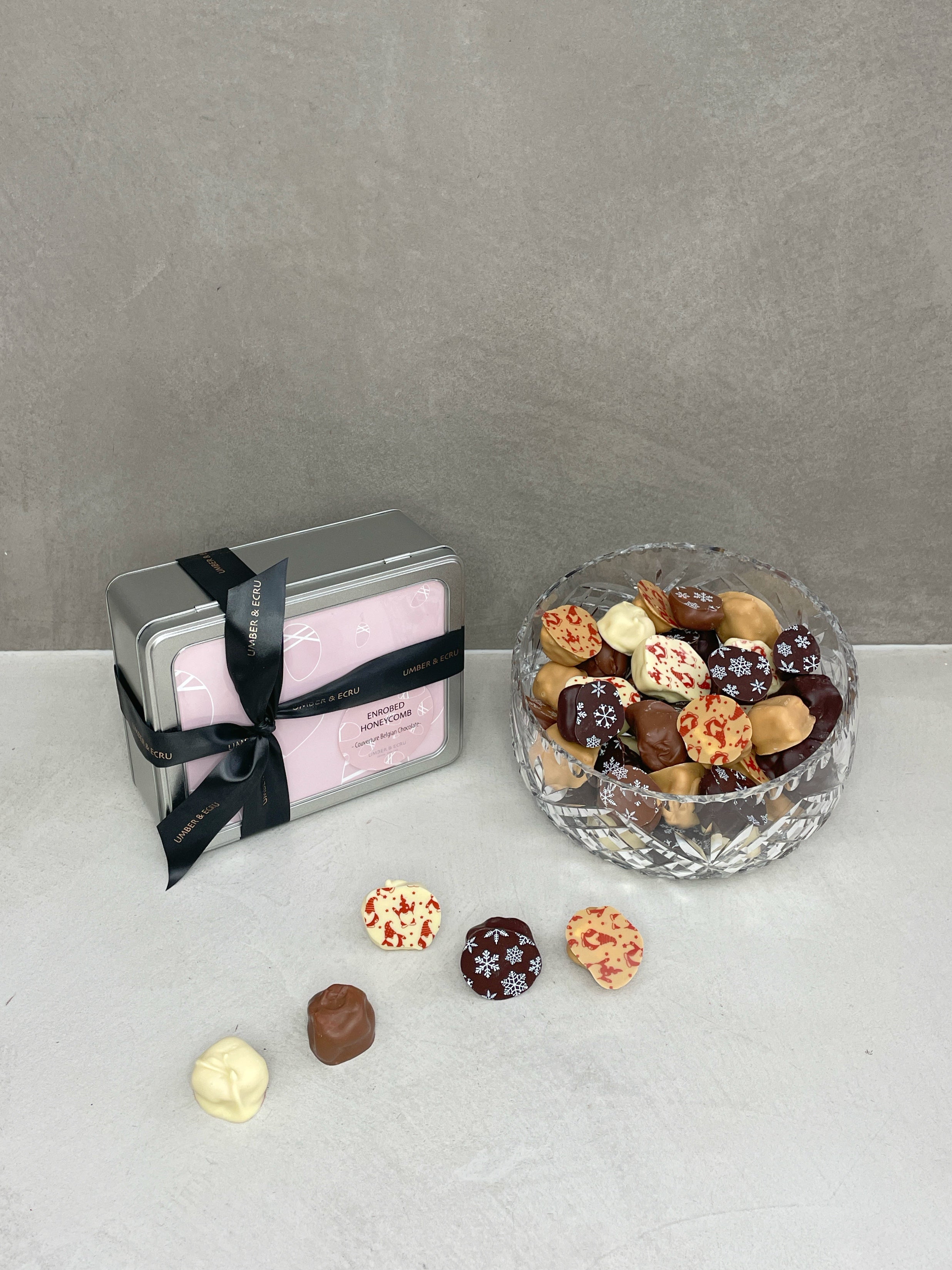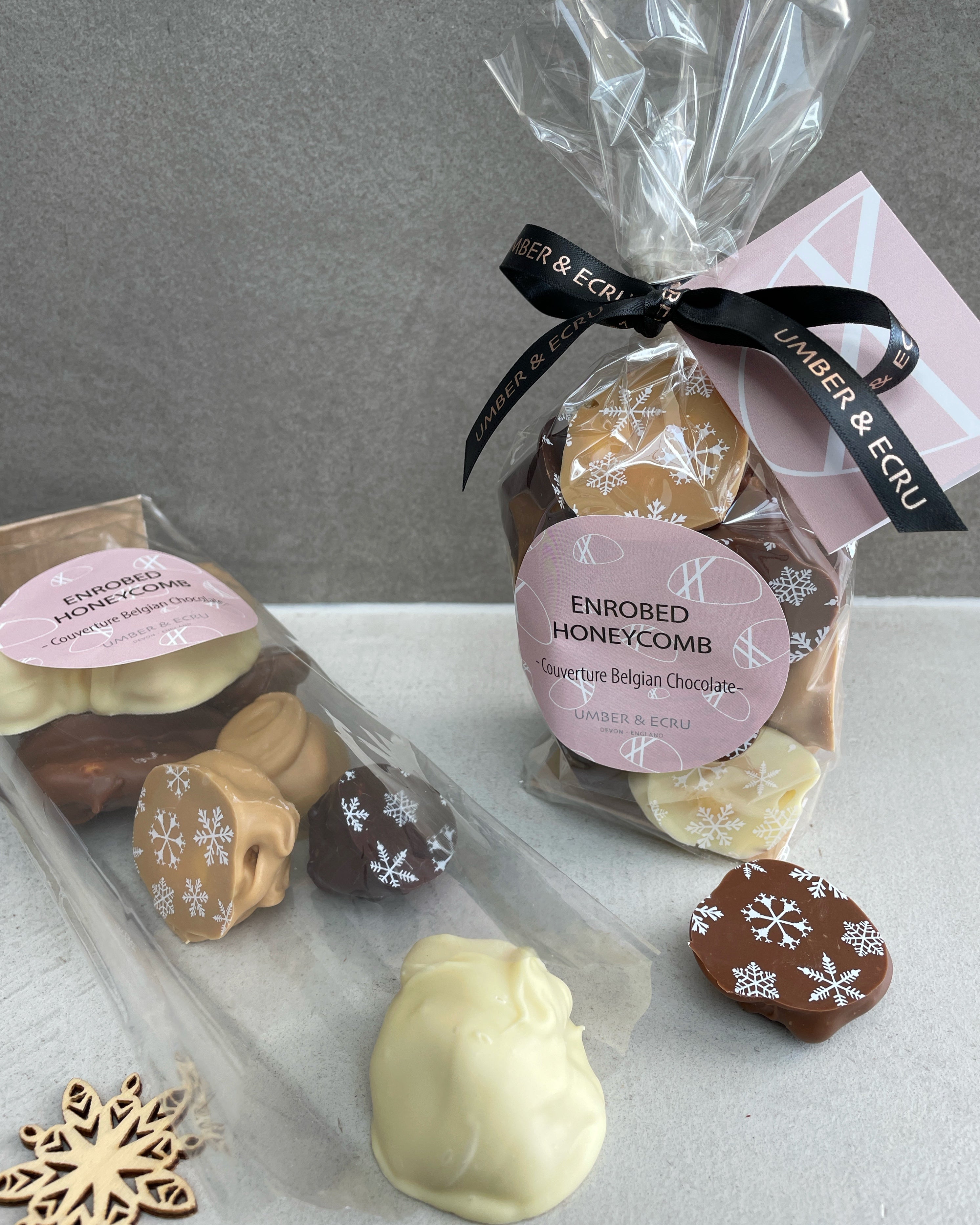 Another Utterly Exquisite , Umber and Ecru classic. Big chunks of Honeycomb, (Cinder Toffee, Hokey Pokey... whatever you want to call it!) sumptuously smothered in a mix of dark, milk, white and gold Belgian chocolate. Each decorated with a snowflake or Santa themed bottom!