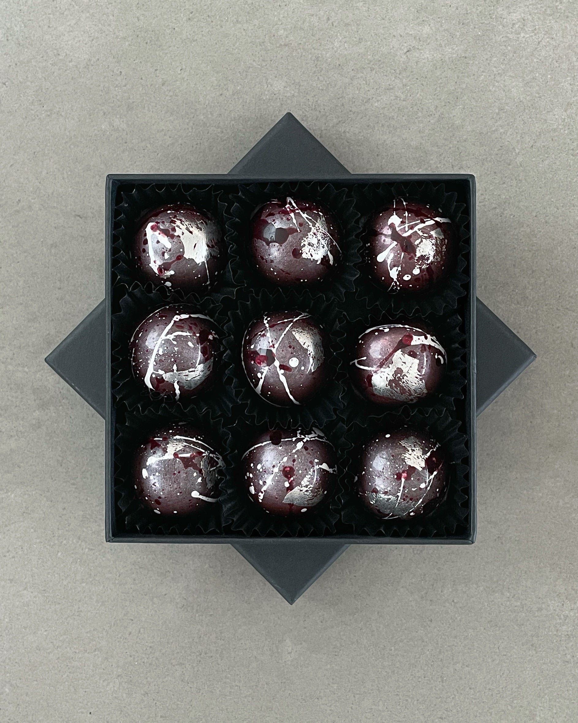 - Belgian dark chocolate with Maraschino Cherry and Cherry Brandy Truffle, decorated with edible silver leaf